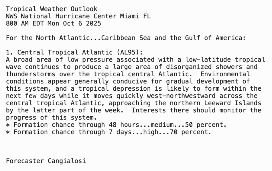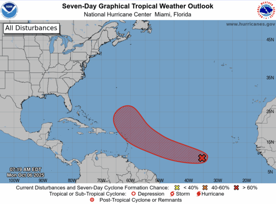 | Tropical Weather Outlook 800 AM EDT Mon 6 Oct 2025 1205 UTC Mon 6 Oct 2025 | |