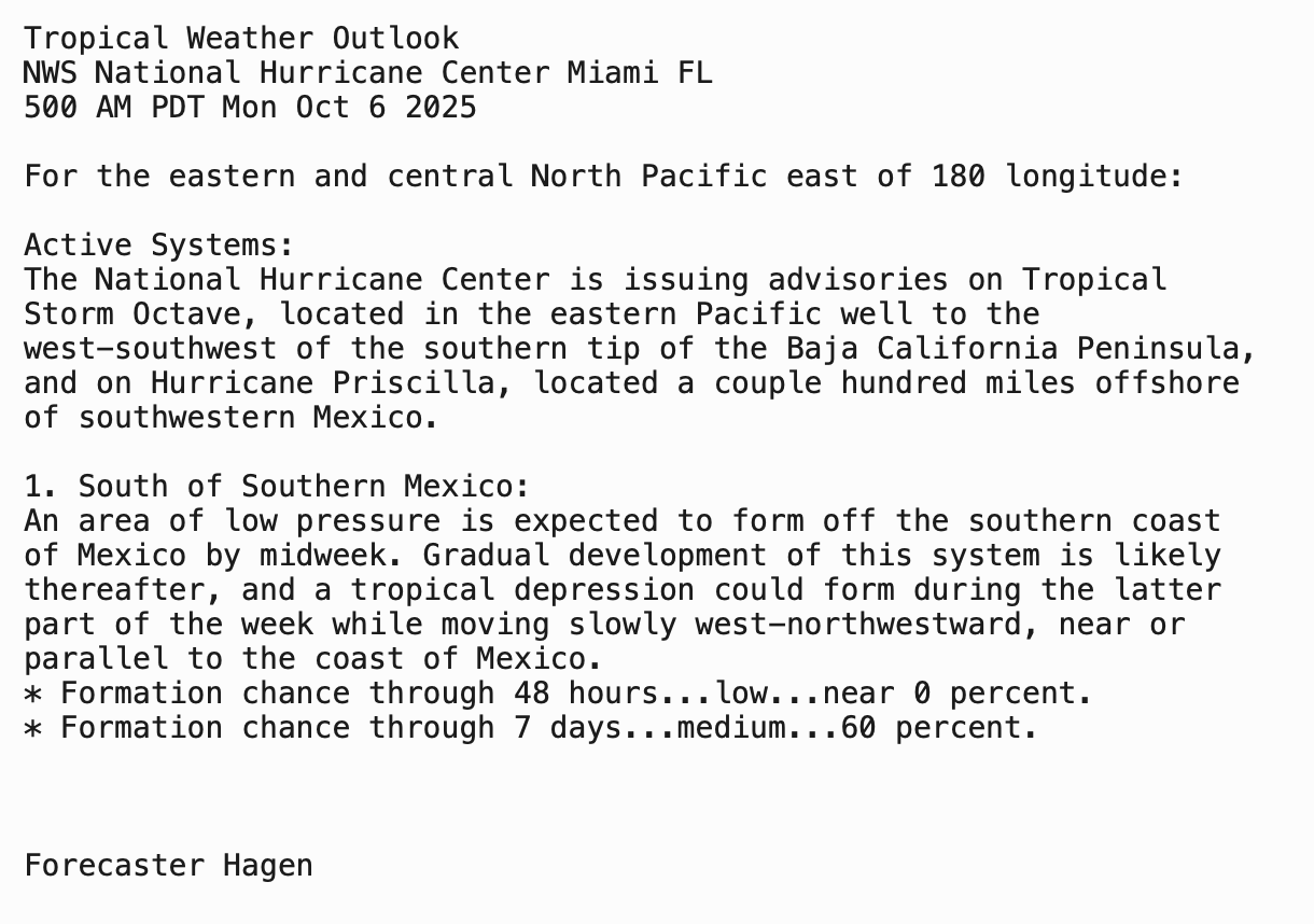 | Tropical Weather Outlook 500 AM PDT Mon 6 Nov 2025 1005 UTC Mon 6 Nov 2025 | |