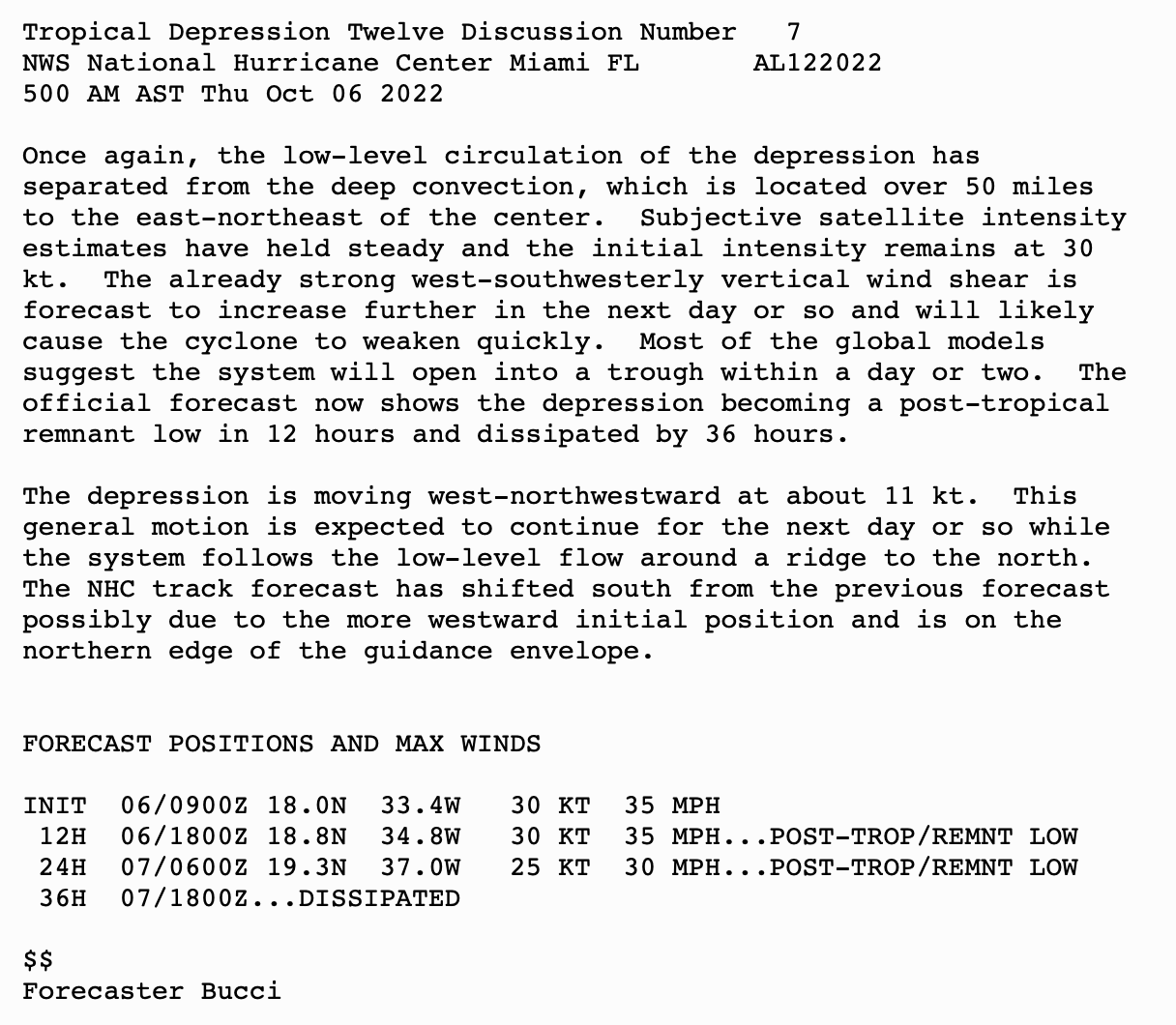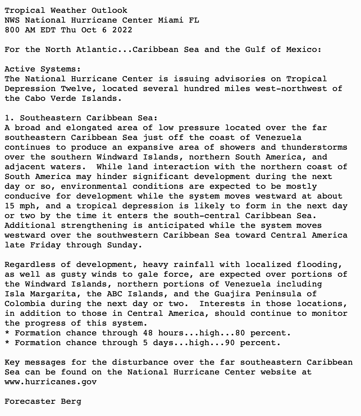 | Tropical Weather Outlook (en Español*) 800 AM EDT Thu Oct 6 2022 1205 UTC Thu Oct 6 2022 | |