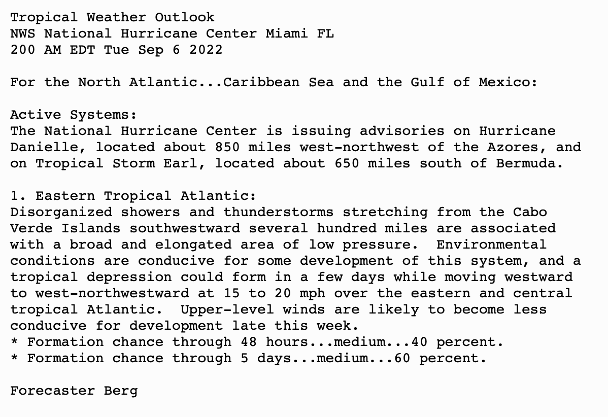 | Tropical Weather Outlook (en Español*) 800 AM EDT Tue Sep 6 2022 1205 UTC Tue Sep 6 2022 | |