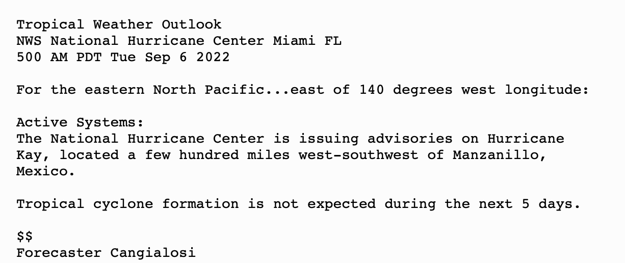 | Tropical Weather Outlook 500 AM PDT Tue Sep 6 2022 Tropical Weather Discussion 1005 UTC Tue Sep 6 2022 | |