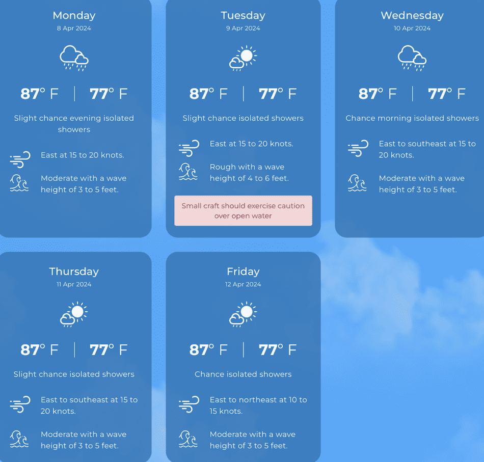Expected temperatures: 77°F to 87°F. Yesterday: H 87.2°F L 77.2.°F