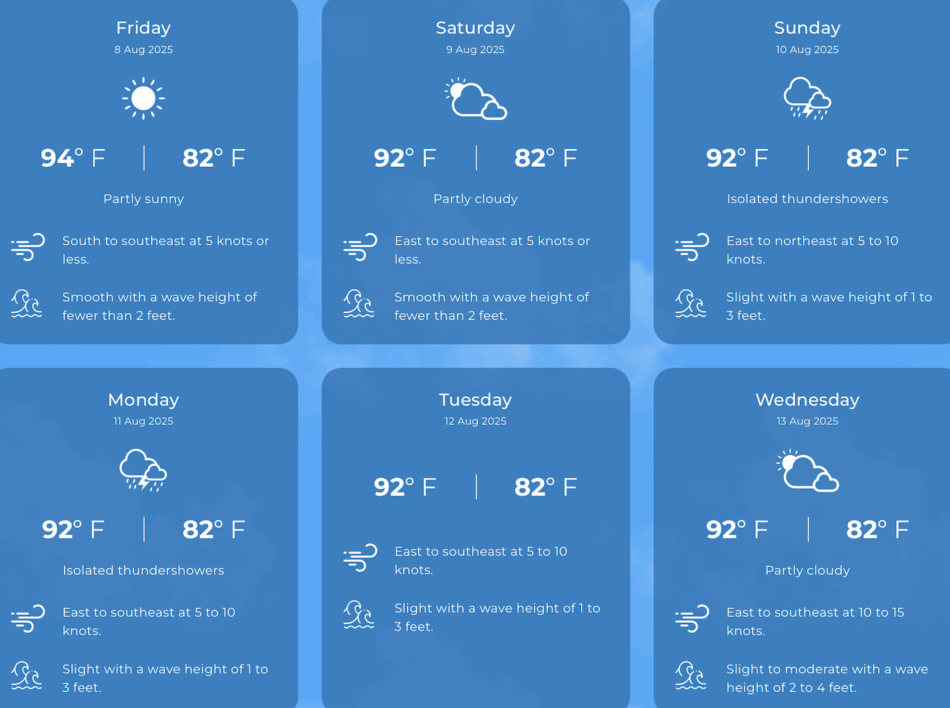 IMPORTANT NOTICEThe times reflected in the tidal table for Grand Cayman are predictions valid as references for sports fishing in areas near the coast of Grand Cayman. THEY ARE NOT SUITABLE FOR NAVIGATION. Remember that to practice any activity at sea like diving, windsurfing and fishing from a boat or underwater fishing should always be consulted with the official tide tables of the port of Grand Cayman.