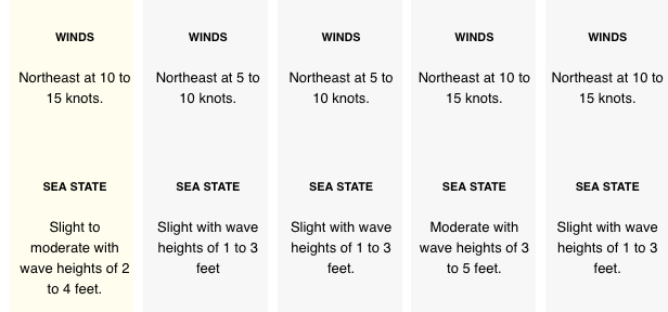 Winds: Today ENE 10-20 mph Tonight ENE 10-15 mph