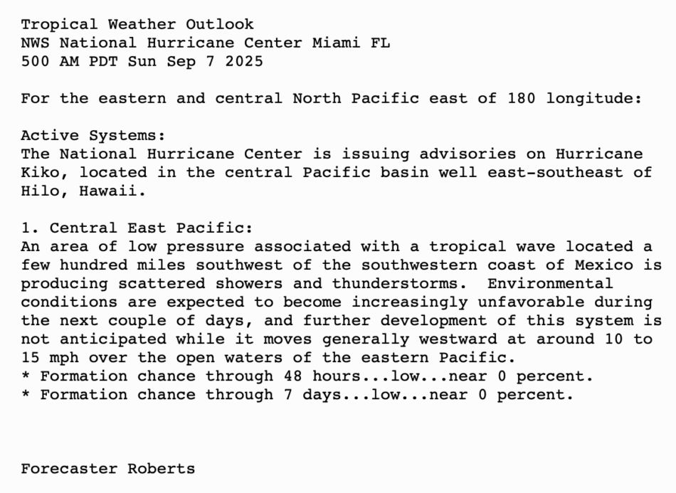 | Tropical Weather Outlook 500 AM PDT Sun 7 Sep 2025 1005 UTC Sun 7 Sep 2025 | |