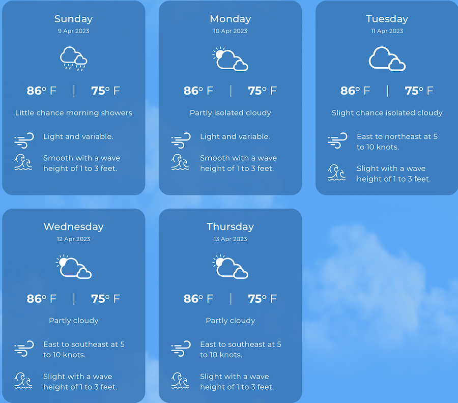 IMPORTANT NOTICEThe times reflected in the tidal table for Grand Cayman are predictions valid as references for sports fishing in areas near the coast of Grand Cayman. THEY ARE NOT SUITABLE FOR NAVIGATION. Remember that to practice any activity at sea like diving, windsurfing and fishing from a boat or underwater fishing should always be consulted with the official tide tables of the port of Grand Cayman.
