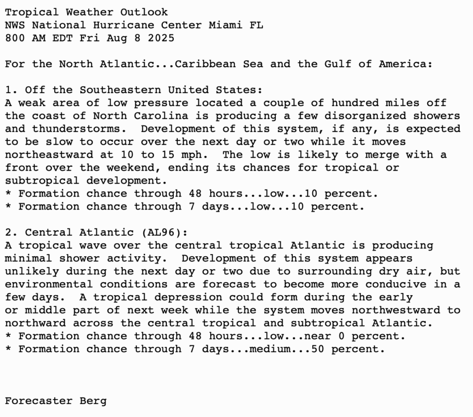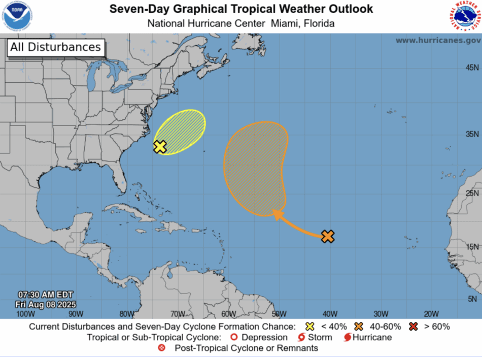 | Tropical Weather Outlook 800 AM EDT Fri 8 Aug 2025 1205 UTC Fri 8 Aug 2025 | |
