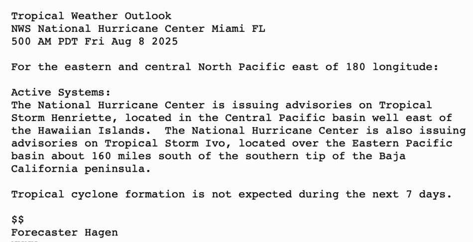 | Tropical Weather Outlook 500 AM PDT Fri 8 Aug 2025 1005 UTC Fri 8 Aug 2025 | |