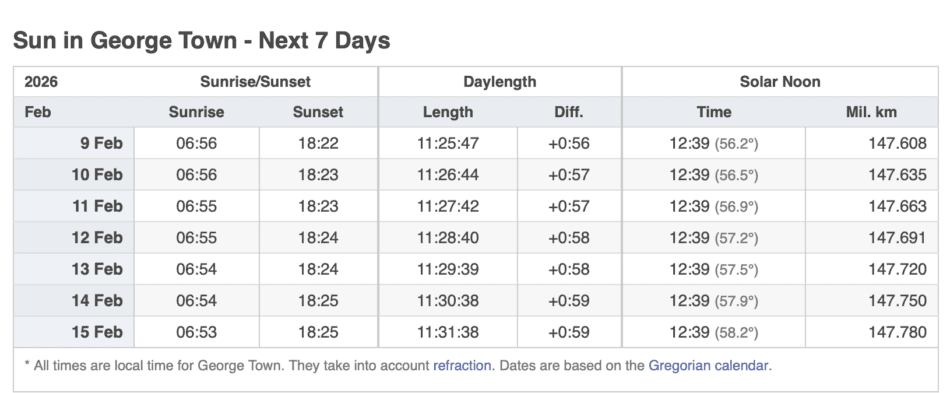 Grand Cayman Sun & Tides Tables February 2026