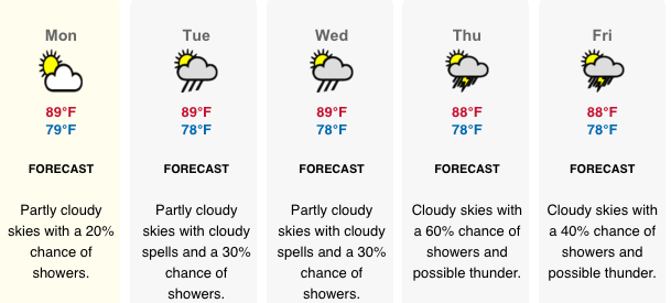 Temperature: Today’s expected temperatures – 82° to 91°F. Yesterday: H 89.75°F L 82.2°F