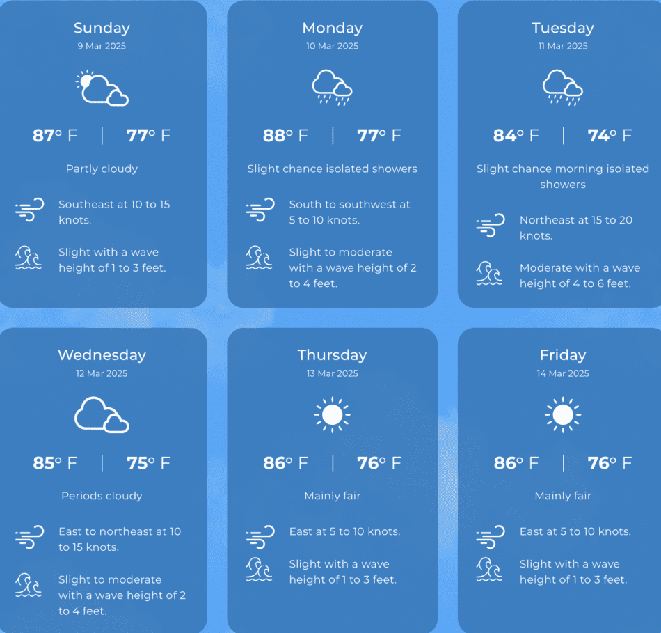 A weak pressure gradient across the Caribbean will continue to support light winds and seas over the Cayman Islands for the next 24 hours.