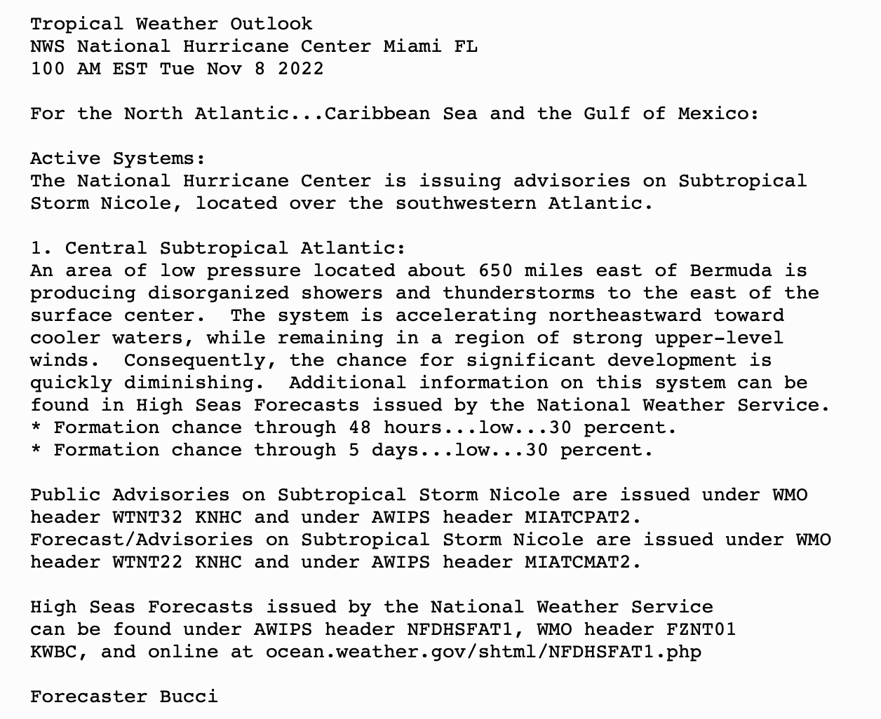 | Tropical Weather Outlook (en Español*) 800 AM EDT Tue Nov 8 2022 1205 UTC Tue Nov 8 2022 | |