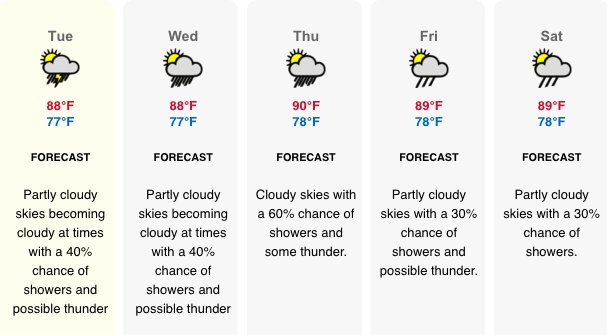 Temperature: Today’s expected temperatures – 78° to 91°F. Yesterday: H 88.7°F L 78.3°F