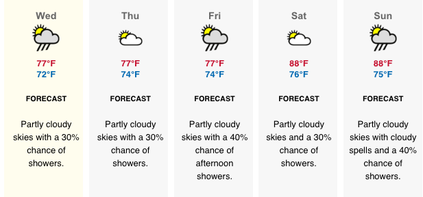 Temperature: Today’s expected temperatures – 74°F to 82°F. Yesterday: H 80.8°F L 74.8F