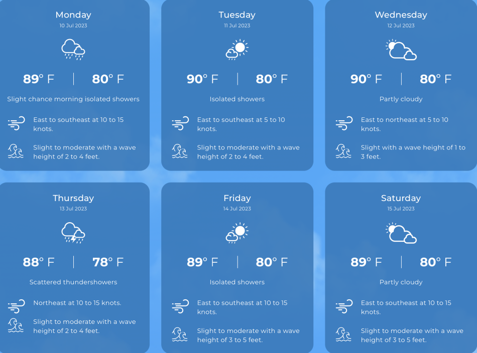 Temperatures: Yesterday – Low 79.4°F, High 89.1°F Today (Expected) – Low 80°F High 89°F
