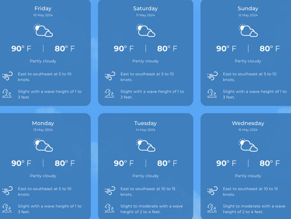 IMPORTANT NOTICEThe times reflected in the tidal table for Grand Cayman are predictions valid as references for sports fishing in areas near the coast of Grand Cayman. THEY ARE NOT SUITABLE FOR NAVIGATION. Remember that to practice any activity at sea like diving, windsurfing and fishing from a boat or underwater fishing should always be consulted with the official tide tables of the port of Grand Cayman.