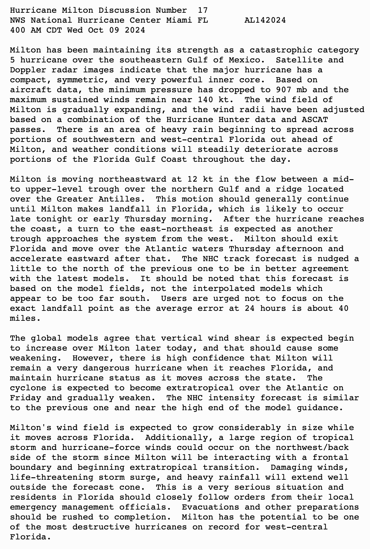 Fresh southwesterly winds along with rough seas will continue across the Cayman area for the next 24 hours as Hurricane Milton moves towards Florida. Radar images show isolated showers in and around the Cayman area drifting towards the north to northeast.