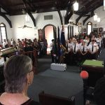 The day started cloudy and rain was threatening but it held off until the laying of the wreaths was completed around the Cenotaph (Memorial Cross) outside Elmslie Church on the waterfront. Then came the downpour and everyone scurried inside the church.
