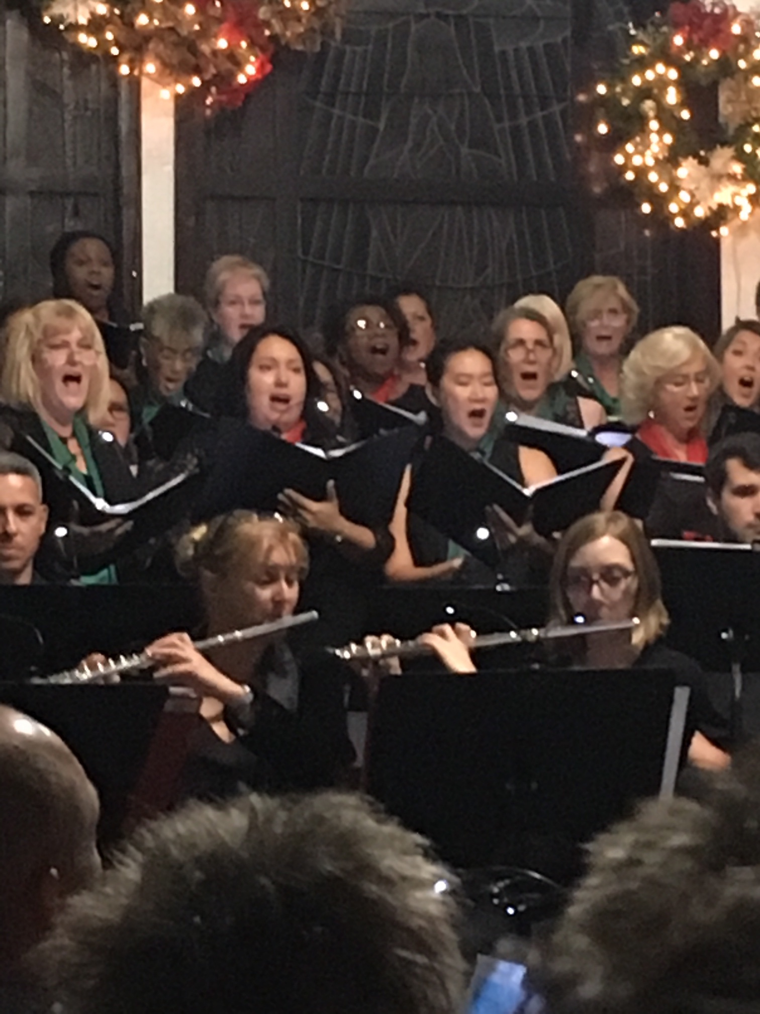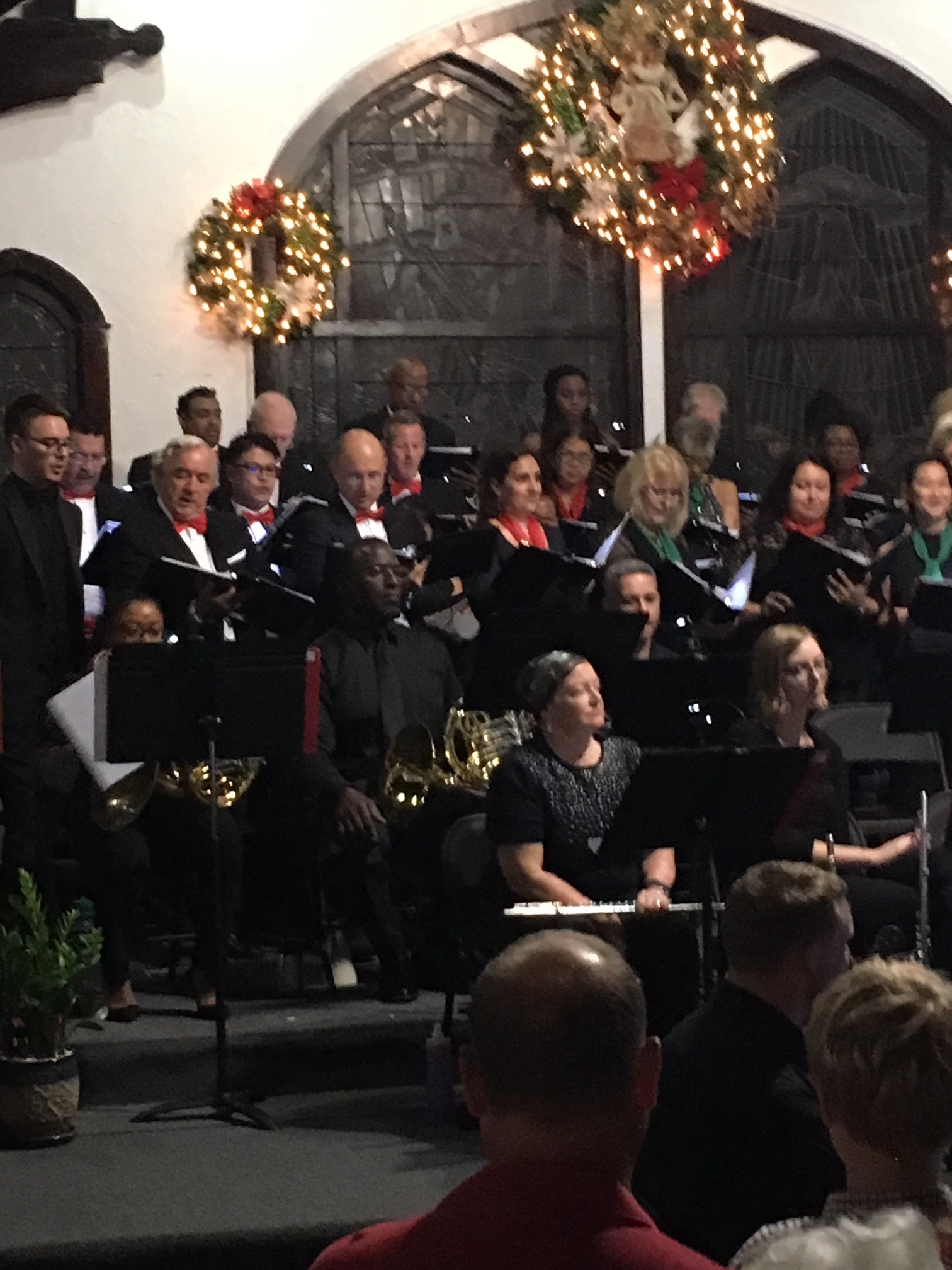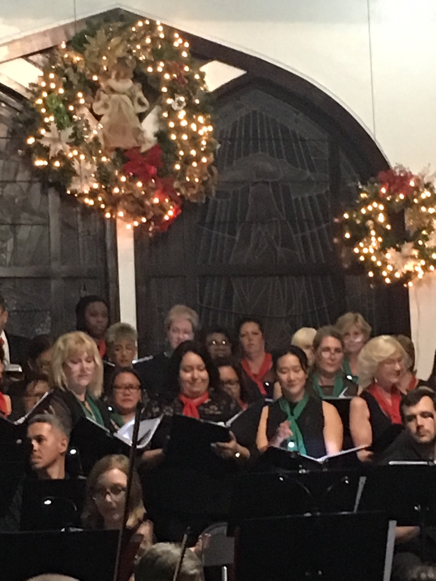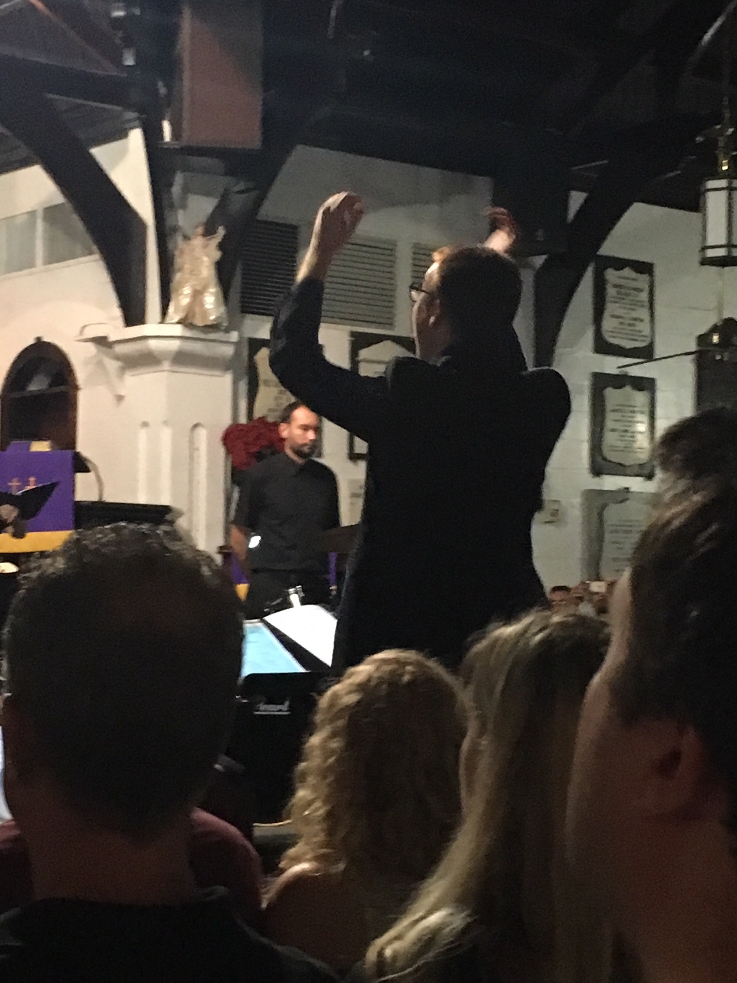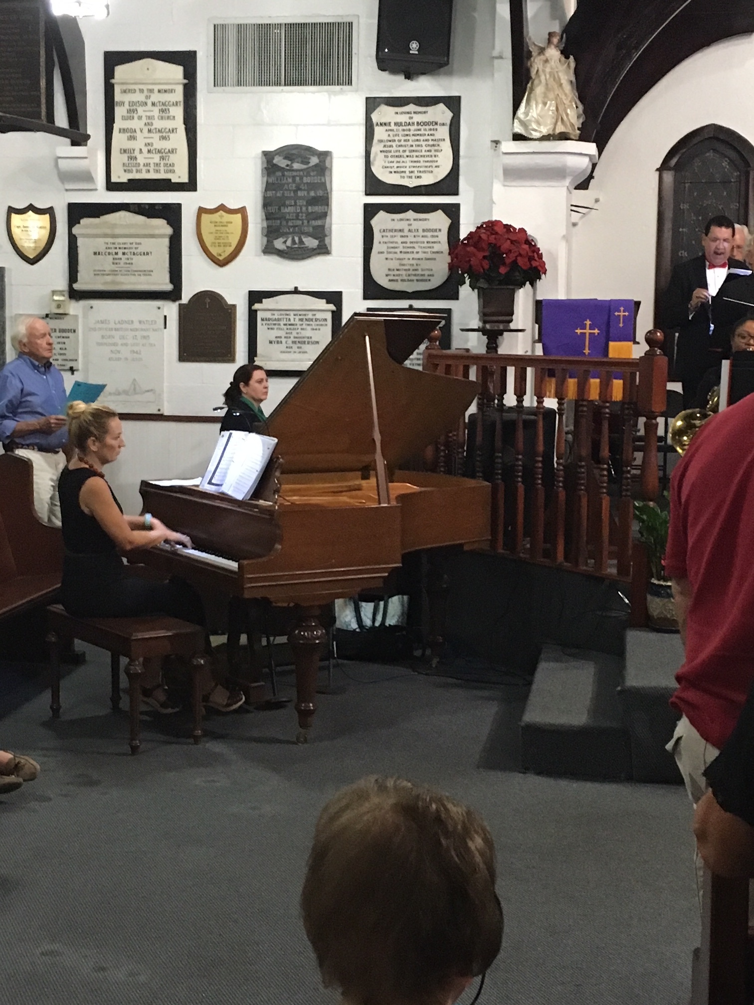 As the conductor’s podium was in two different places she had to scramble between them when conducting the choir or the orchestra or both. As some members of the choir were also musicians she had to maneuver around them, too. At one time she even called out, “It’s gridlock” when everyone involved in this scampering to their places came to an abrupt stop.