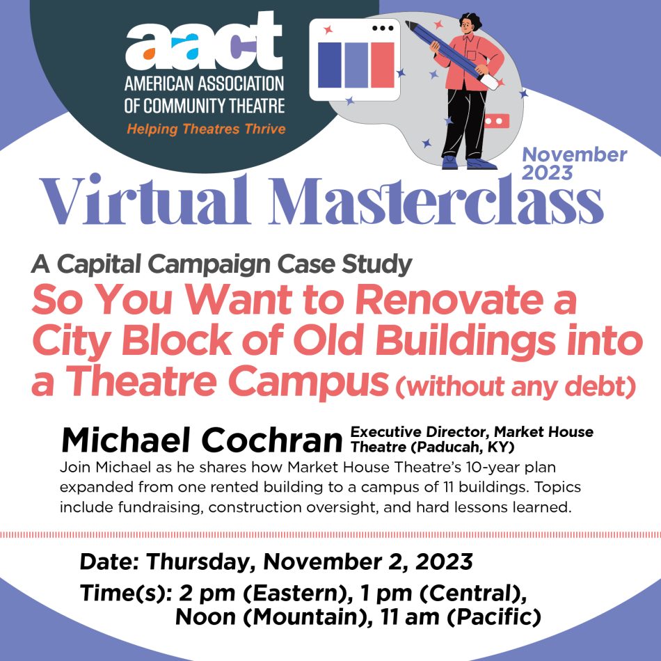 AACT Virtual Masterclass: A CAPITAL CAMPAIGN CASE STUDY – SO YOU WANT TO RENOVATE A CITY BLOCK INTO A THEATRE CAMPUS (W/O ANY DEBT): Thurs, November 2