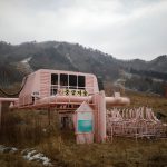 The resort has since fallen into disrepair. Decommissioned equipment such as this pink ski lift station hints at a cheerier past.