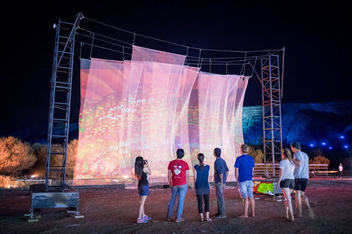 Right in front of the Ranges lies the rest of the festival, in the Alice Springs Desert Park. There’s a returning showcase called Grounded (Apmere Melangke [There’s No Place Like Home]), featuring giant ground projections from Ikuntji artists Eunice Napanangka Jack and Gordon Butcher, and Arrernte artists Patricia Ansell Dodds, Carol Turner and Greg McAdam, and Lindy Brodie from Barkly Regional Arts.