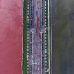 Between two worlds: a salt lake, coloured red by algae is split by a road in Yuncheng, Shanxi Province.