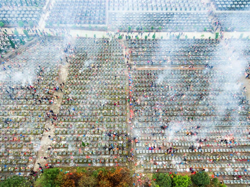 People burn joss paper money as they pray at a public cemetery during Qingming Festival or Tomb Sweeping Festival in Fuzhou, Jiangxi Province.
