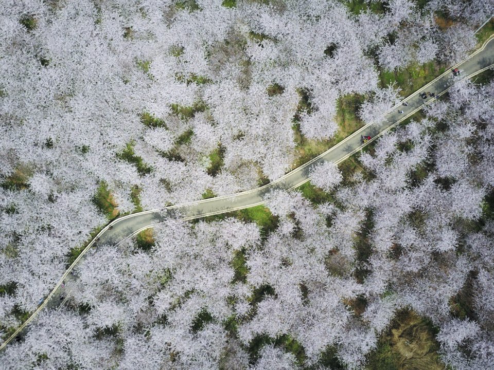 Beautiful cherry blossom is seen along a road in Gui’an New District, Guizhou Province.