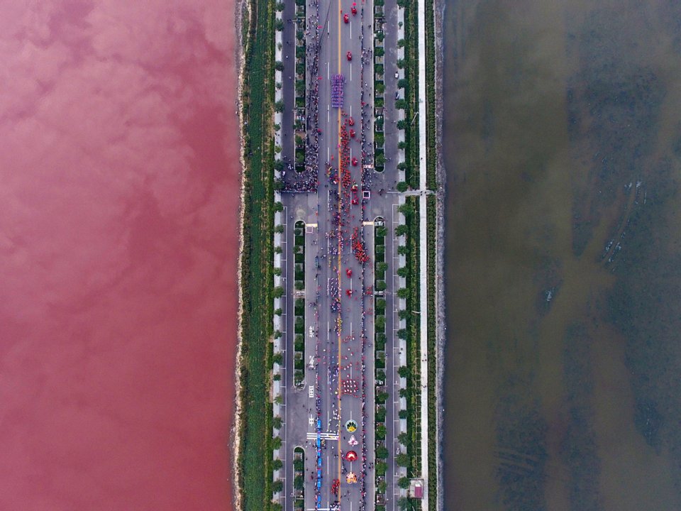 Between two worlds: a salt lake, coloured red by algae is split by a road in Yuncheng, Shanxi Province.