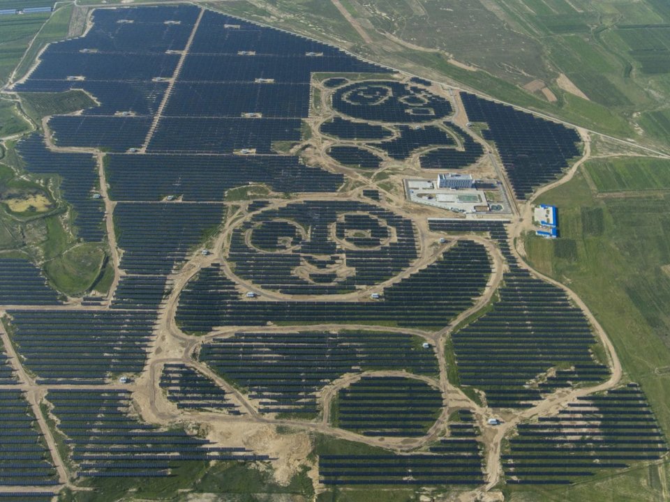 The panda-shaped solar plant in Datong, China, is seen from above.