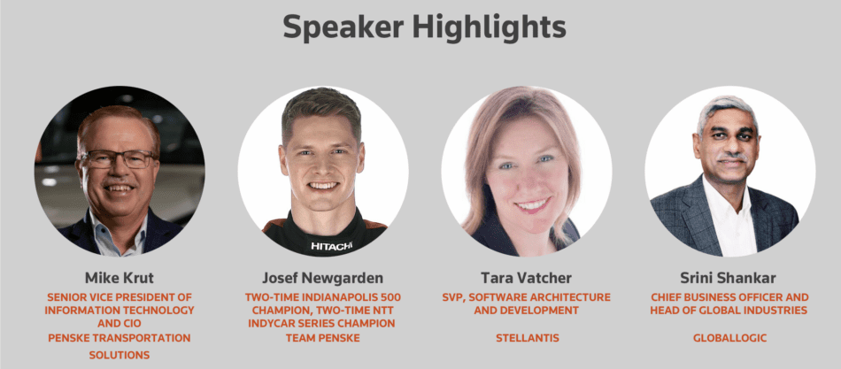In a recent webinar we hosted, two-time NTT IndyCar Series champion, Josef Newgarden, spoke as a panelist alongside senior executives from Stellantis, Penske Transportation Solutions and GlobalLogic to explore how to accelerate your digital aspirations and transform your businesses with AI.