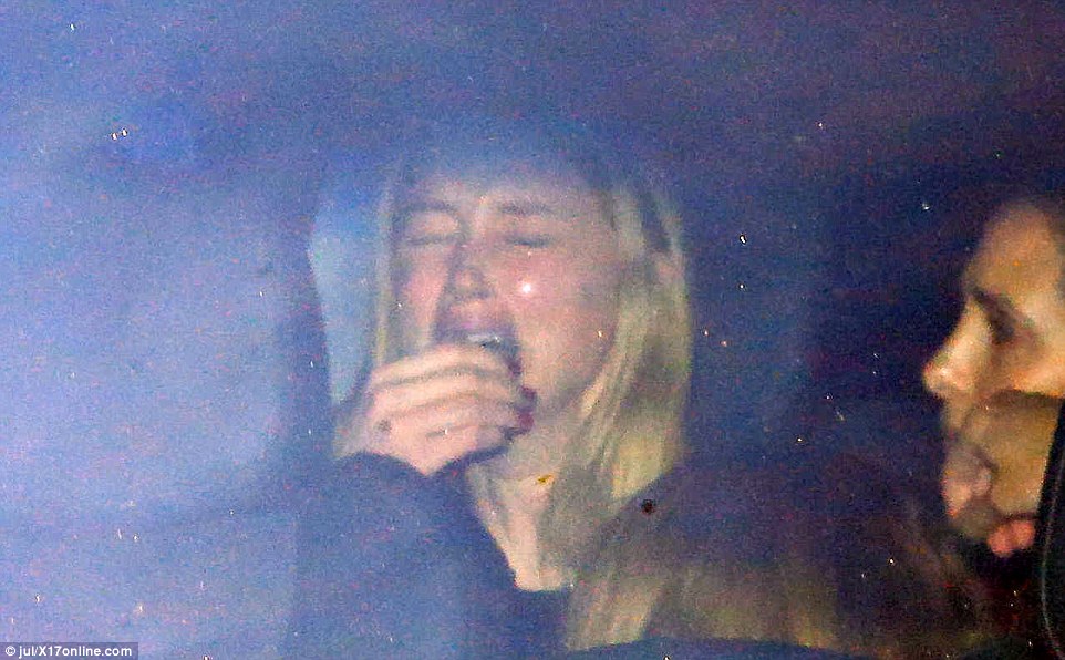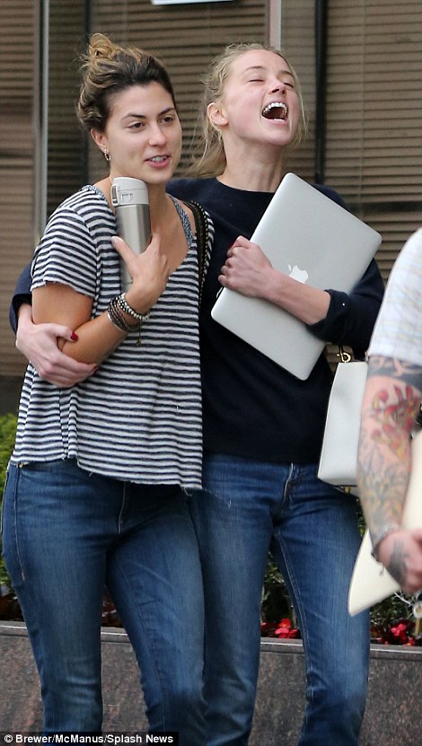 The actress, who has filed for divorce from Johnny Depp and accused him of domestic violence, laughed loudly and hugged a female friend as they left the office building and walked to a waiting limo
