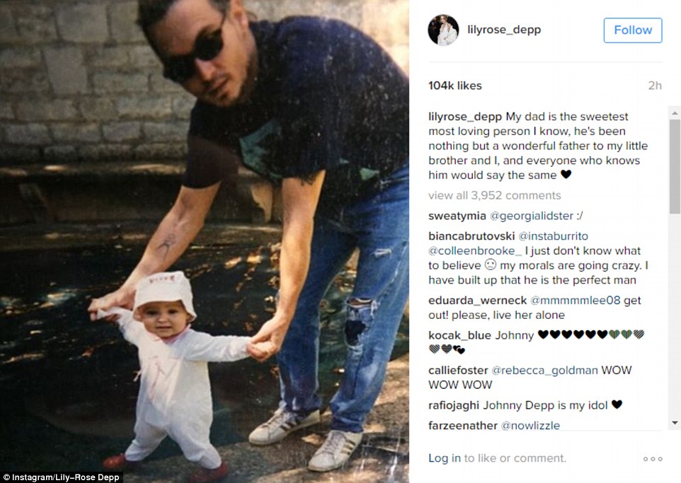 Defiant: Lily-Rose Depp posted this throwback photo of her father to defend him against abuse claims. She also wrote a touching testimony, calling him a ‘wonderful father’ and ‘the sweetest most loving person I know’
