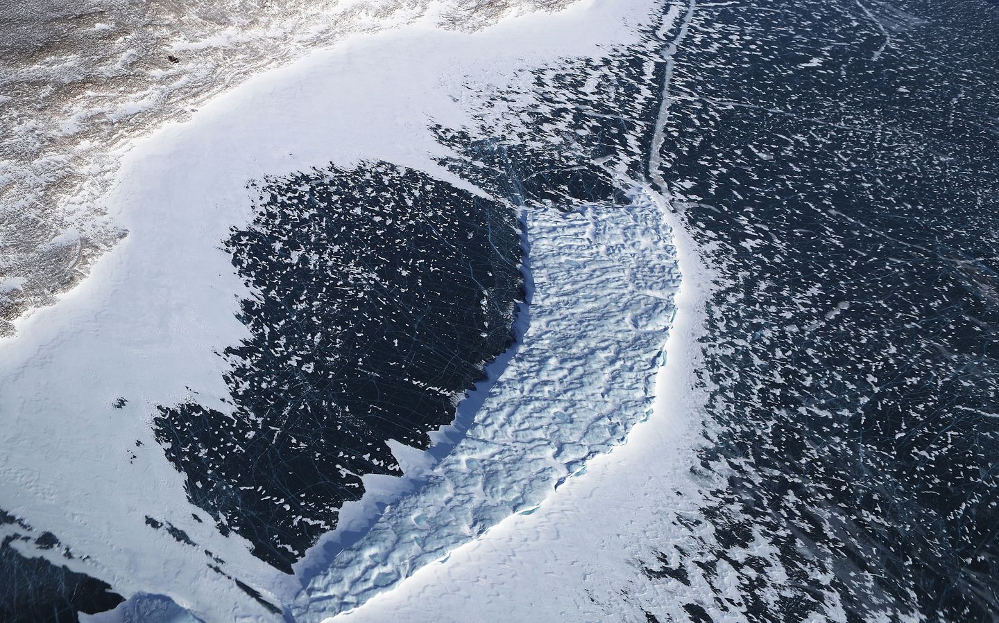 The C-130 flies over a long frozen-over sea ice lead.