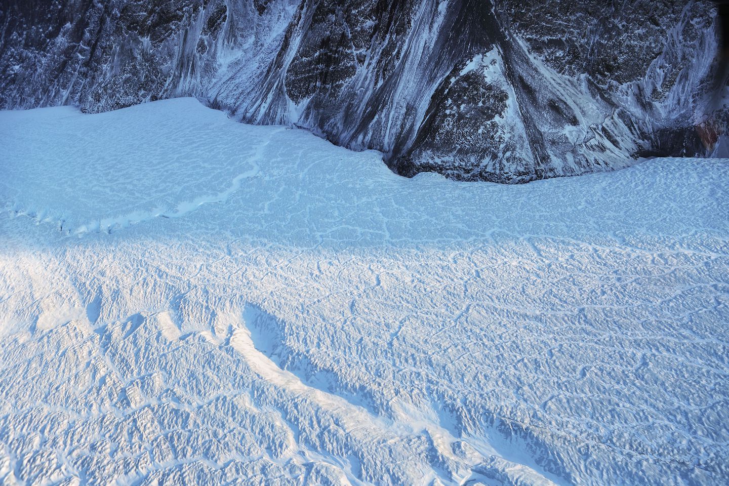 Katabatic wind-blown snow caught behind craggy peaks, near Meehan Glacier in NW Greenland.