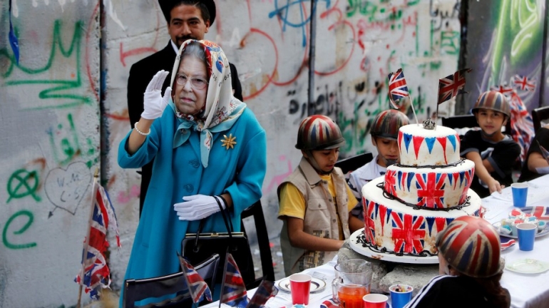 A person, dressed as Britain’s Queen Elizabeth II, gestures during an event ahead of the anniversary of the Balfour Declaration, outside Banksy’s Walled Off Hotel in the West Bank city of Bethlehem November 1, 2017. REUTERS/Mussa Qawasma