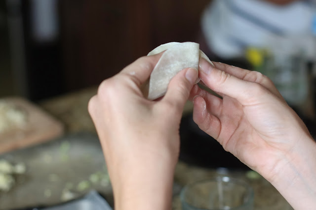 To start, you put a tablespoon of filling in the middle of the wrapper.