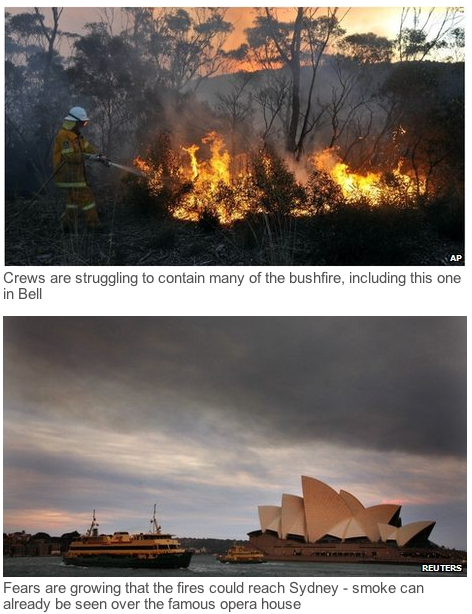 Officials have warned that the three main bushfires – two in the Blue Mountains and one near the town of Lithgow – could become one huge fire in the coming days, possibly threatening Sydney.