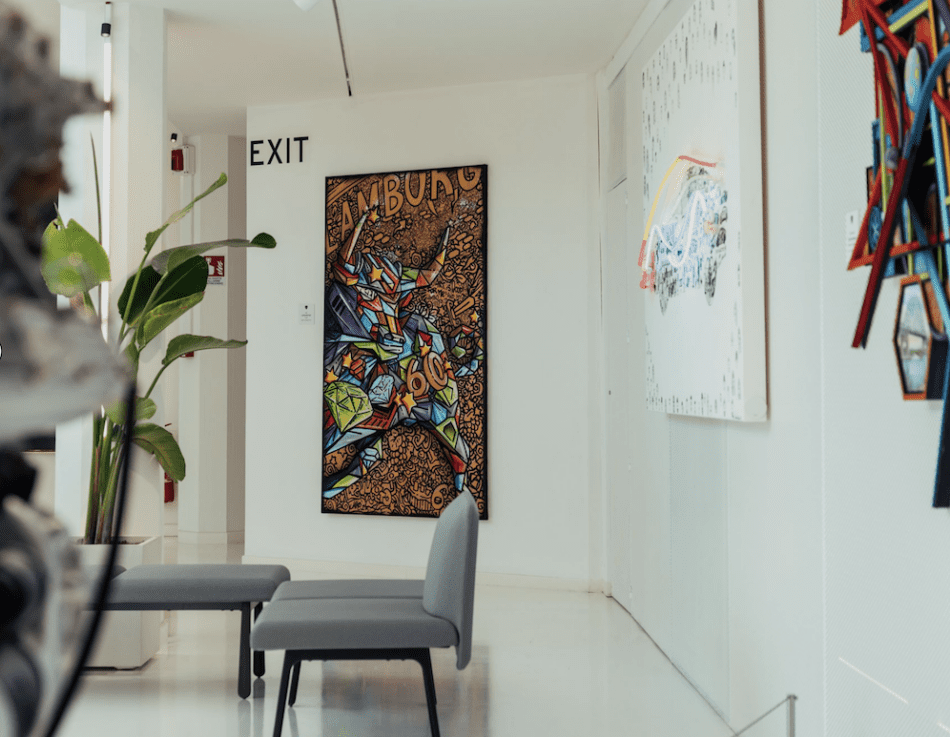 It is precisely with the idea of a narrative journey that the artworks are placed in different areas of the company premises. Welcoming the visitors outside the museum is the imposing bull, symbol of the company, made of cast bronze and life-size. Inside, creations range from works that celebrate the iconic nature of the cars on display in the Lamborghini Museum to canvases with bold, vibrant colors that evoke the dynamic atmosphere of the production lines.