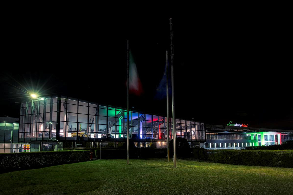 Automobili Lamborghini lit up in the colours of the national tricolore flag, in solidarity with the community and Italy nationally during the Coronavirus pandemic.