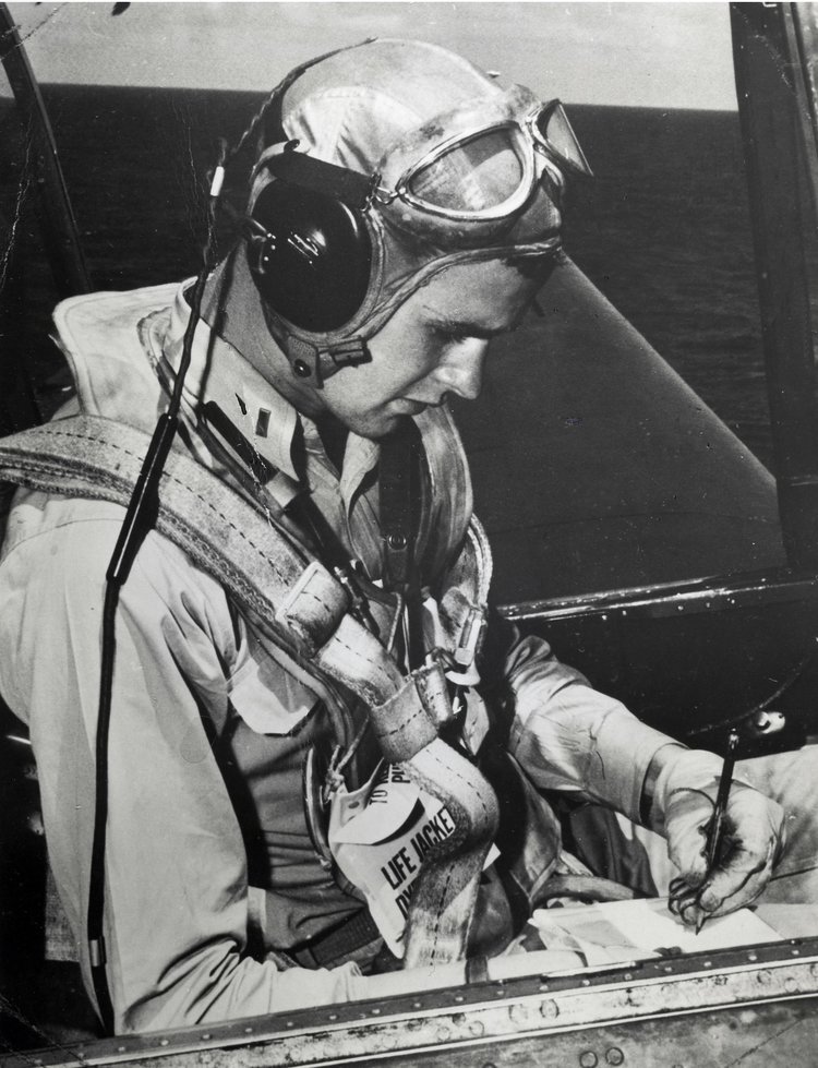George H. W. Bush flying a TBM Avenger off the light aircraft carrier USS San Jacinto in 1944. US Navy