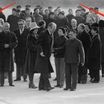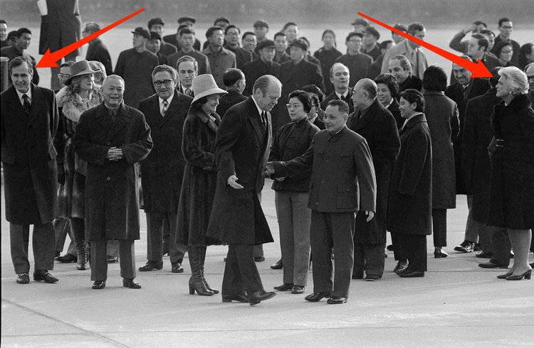 Chinese dignitaries walk with US President Gerald Ford, center left, in Beijing on Dec. 1, 1975. Accompanying Ford are George Bush, extreme left, Henry Kissinger Secretary of State, fourth from left, Betty Ford, behind President Ford, and Barbara Bush, extreme right. AP