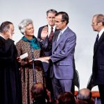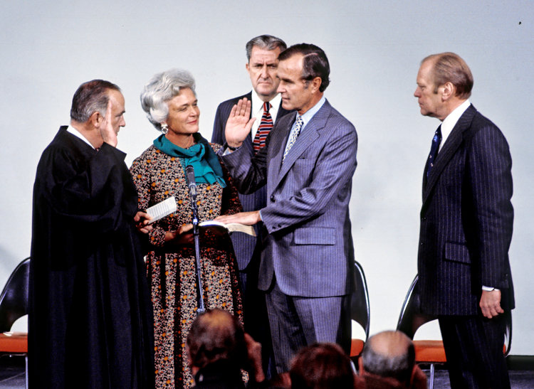 George is sworn in as new director of the Central Intelligence Agency by US Supreme Court Associate Justice Potter Stewart as Barbara and President Gerald R. Ford look on at CIA headquarters in Langley, Virginia on January 30, 1976. Barry Soorenko / CNP /MediaPunch/IPX