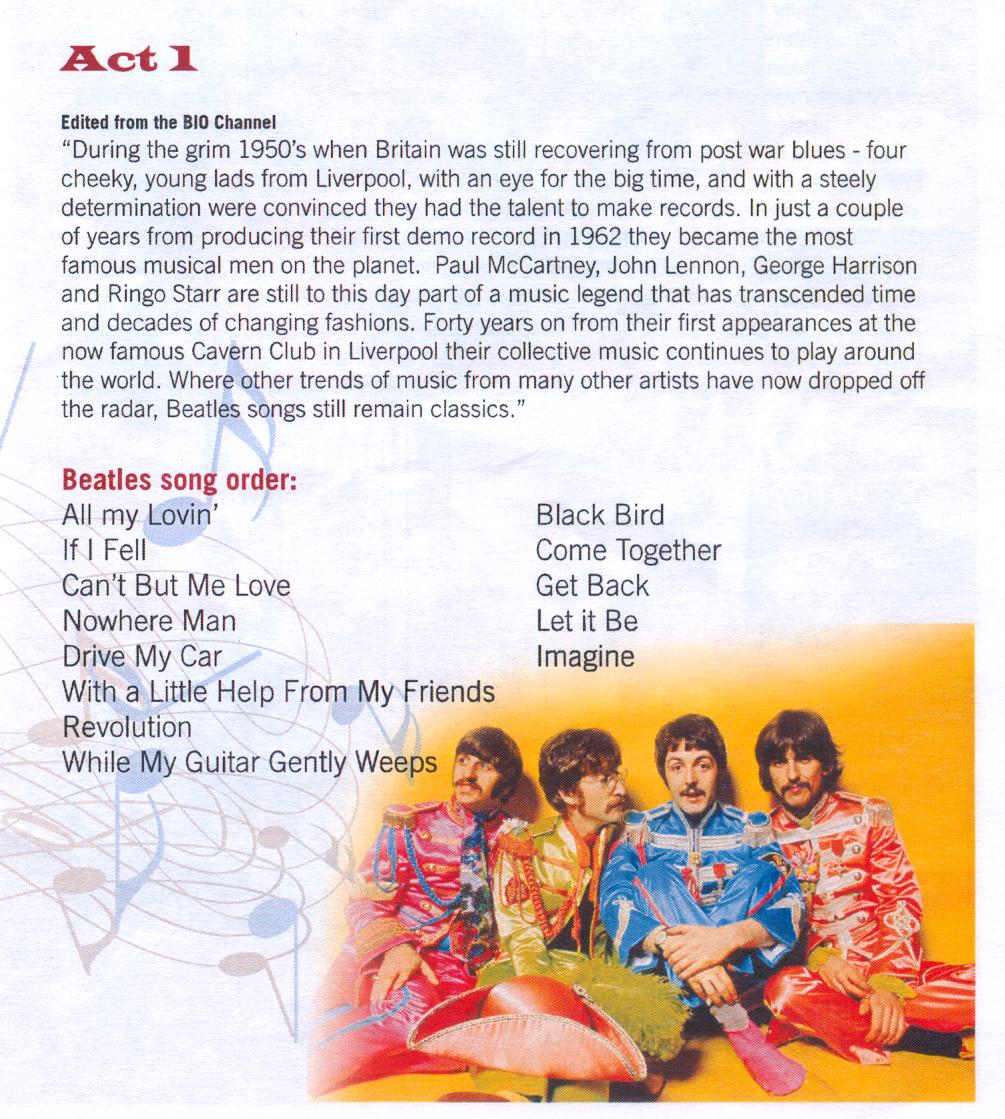 As a side note – one song, Imagine, is technically not a Beatles song but submitted for inclusion into this programme as it is one of Beatle John Lennon’s finest most long lasting achievements.