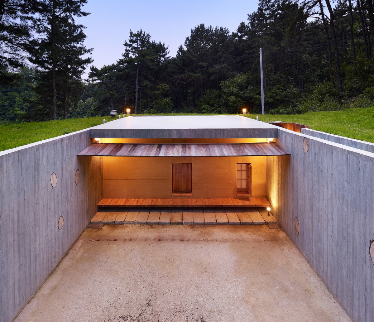 Built in 2009 in memory of a Korean poet, the Earth House in Seoul has two courtyards connecting six single rooms, a kitchen, a study, and a bathroom with a wooden tub and toilet.