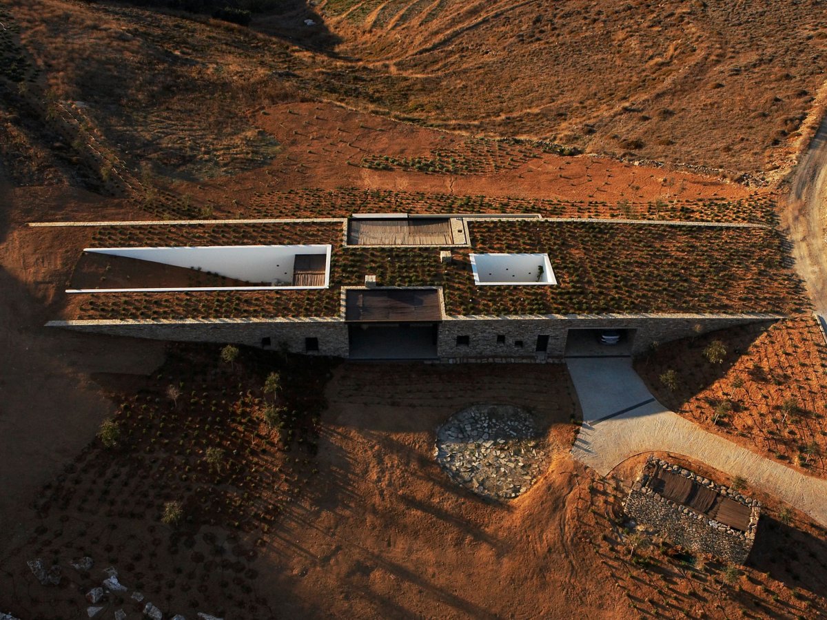 This house on the Greek island of Antiparos sits right where two slopes meet. Two long stone walls bridge the hills, allowing the house to naturally blend in the space.