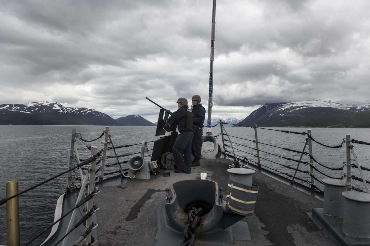 Sailors man a .50-caliber machine gun aboard the Arleigh Burke-class guided-missile destroyer USS Ross (DDG 71) as the ship transits the Norwegian Sea, June 29, 2017.