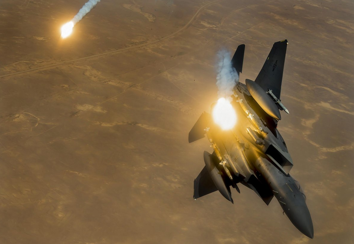 An F-15E Strike Eagle fires flares during a flight in support of Operation Inherent Resolve, June 21, 2017.