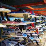 Windsurfing boards at Jibe City, a windsurfing center in Lac Bay.